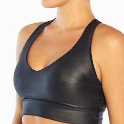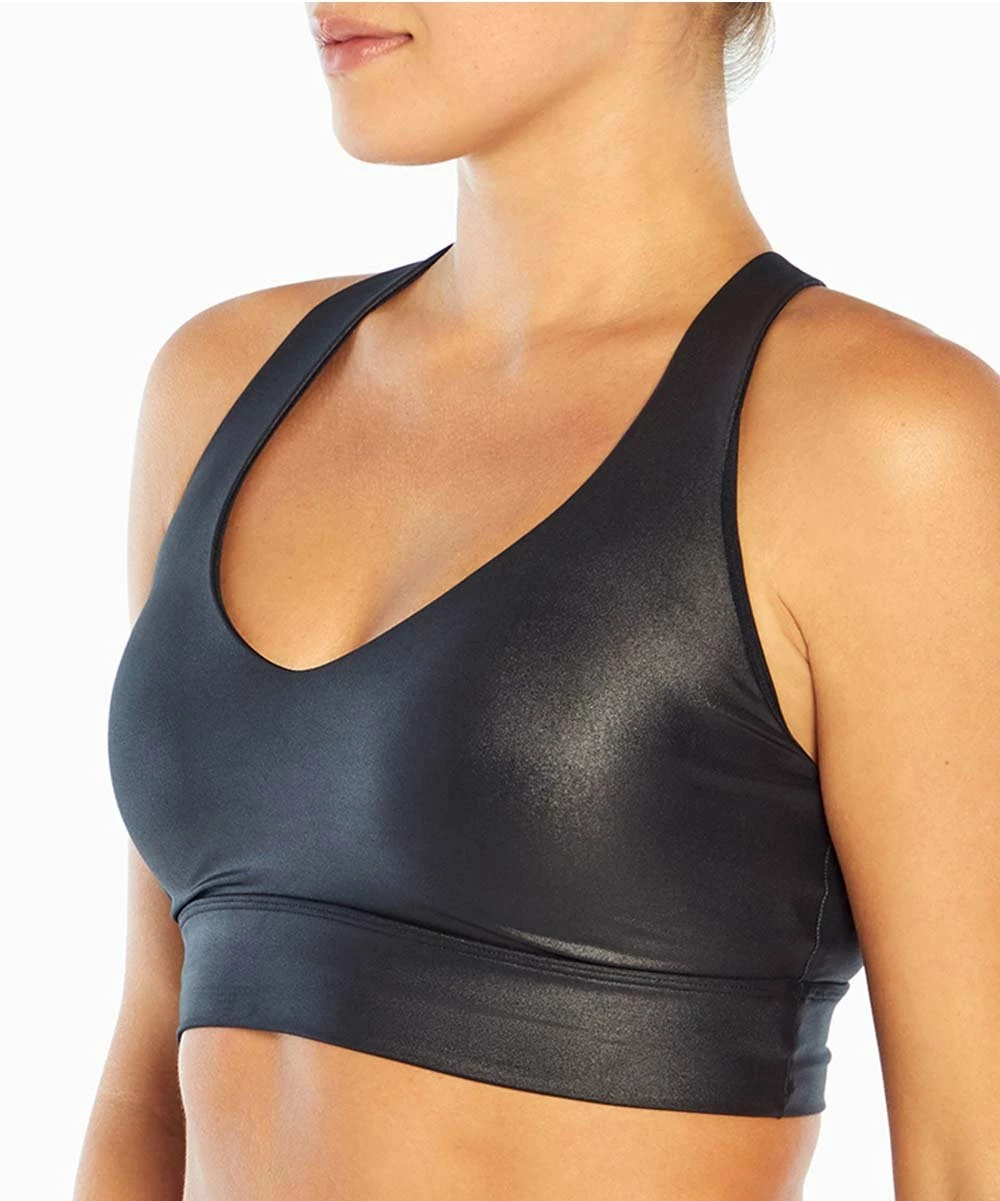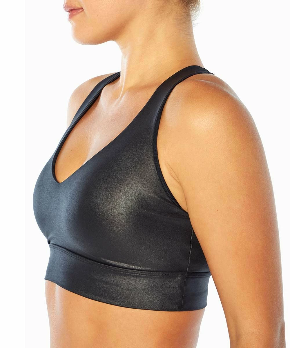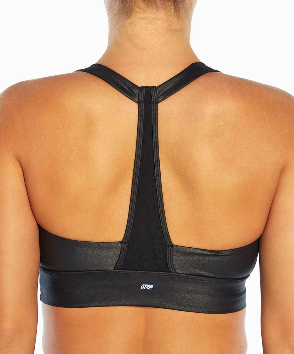 Feel your best in this racerback sports bra designed with a shiny finish and a unique T-strap design. A wide band ensures a snug fit that won’t ride up during intense workouts.