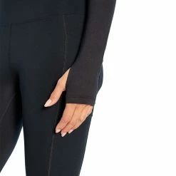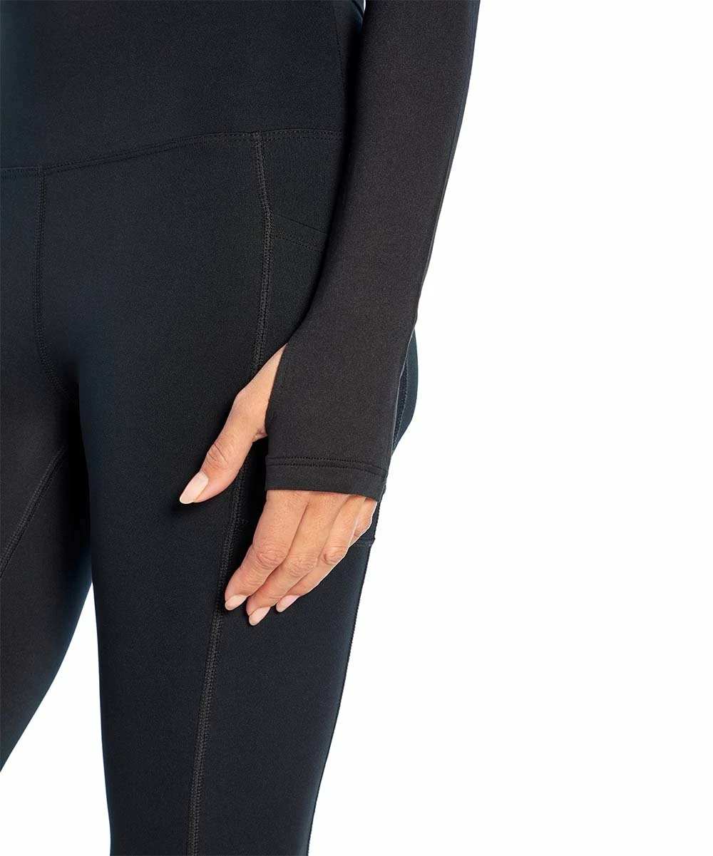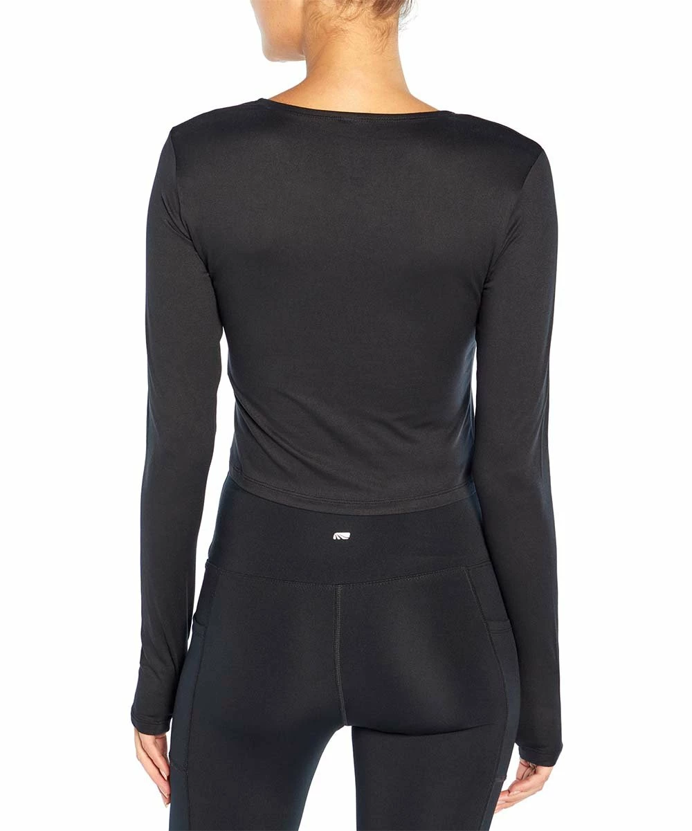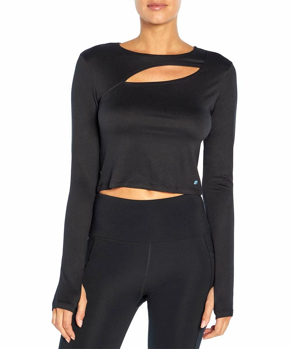 Sleek long-sleeve top with a front cutout under the boat neckline and thumbhole sleeves.