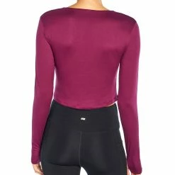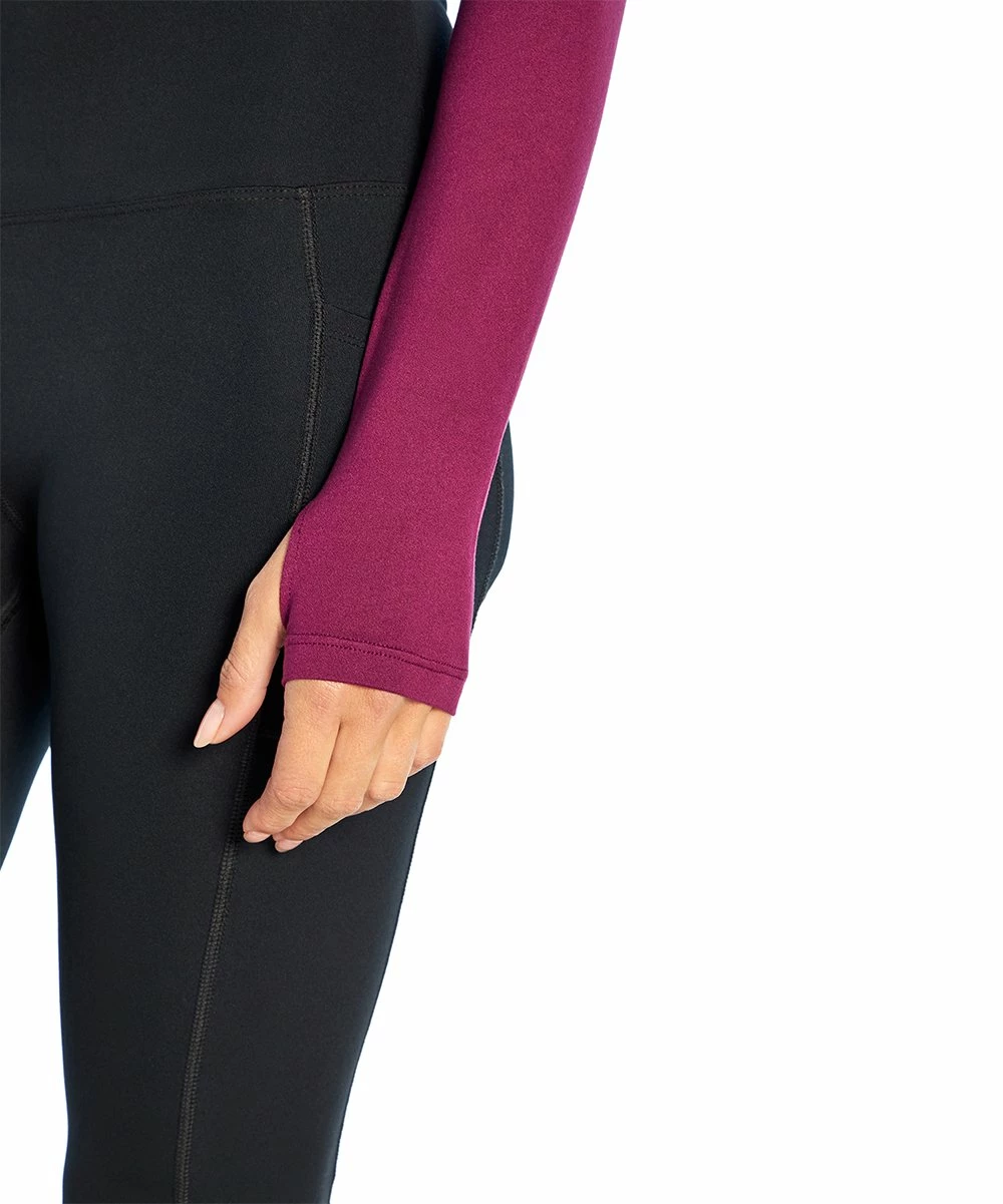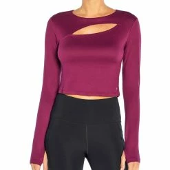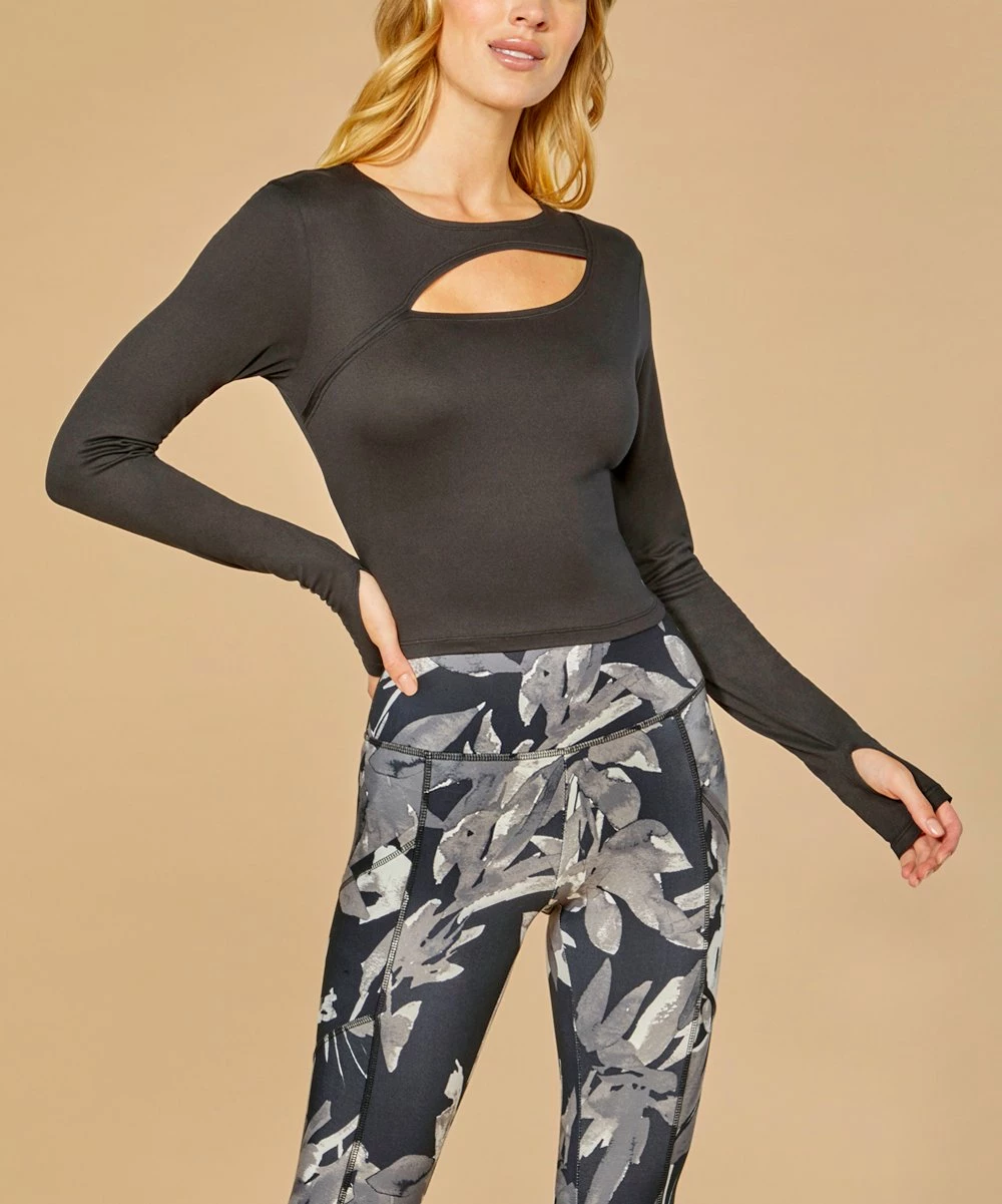 Power through tough workouts with this stretch-enhanced crop top showcasing a keyhole detail at the neckline and secure thumb holes at the sleeve cuffs.
