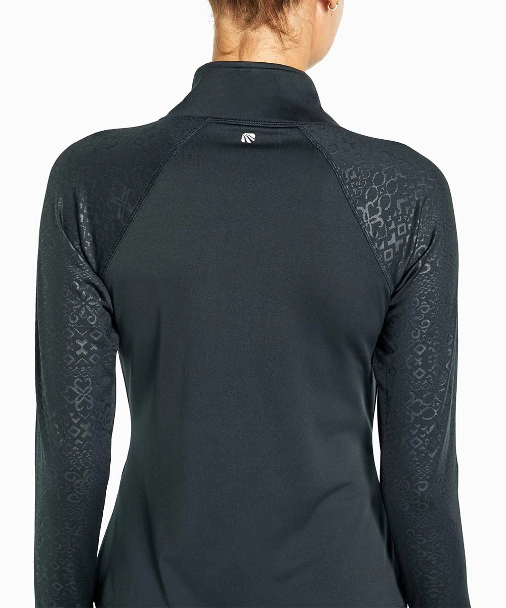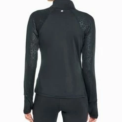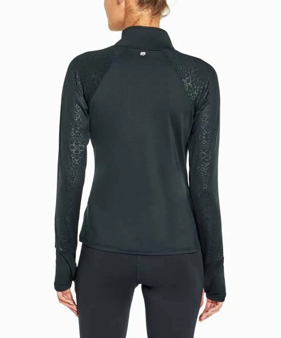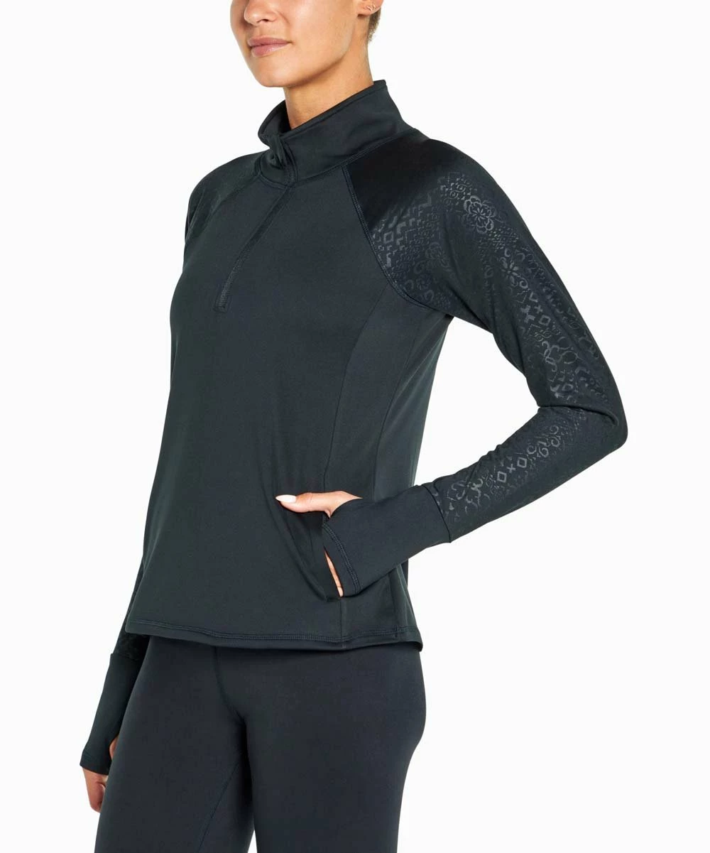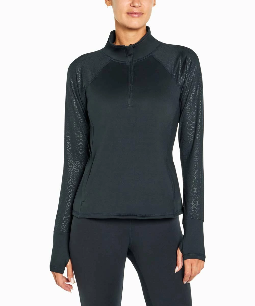 Stretch-rich fabric and convenient thumbholes add a sporty feel to this contrast-sleeve quarter-zip pullover.