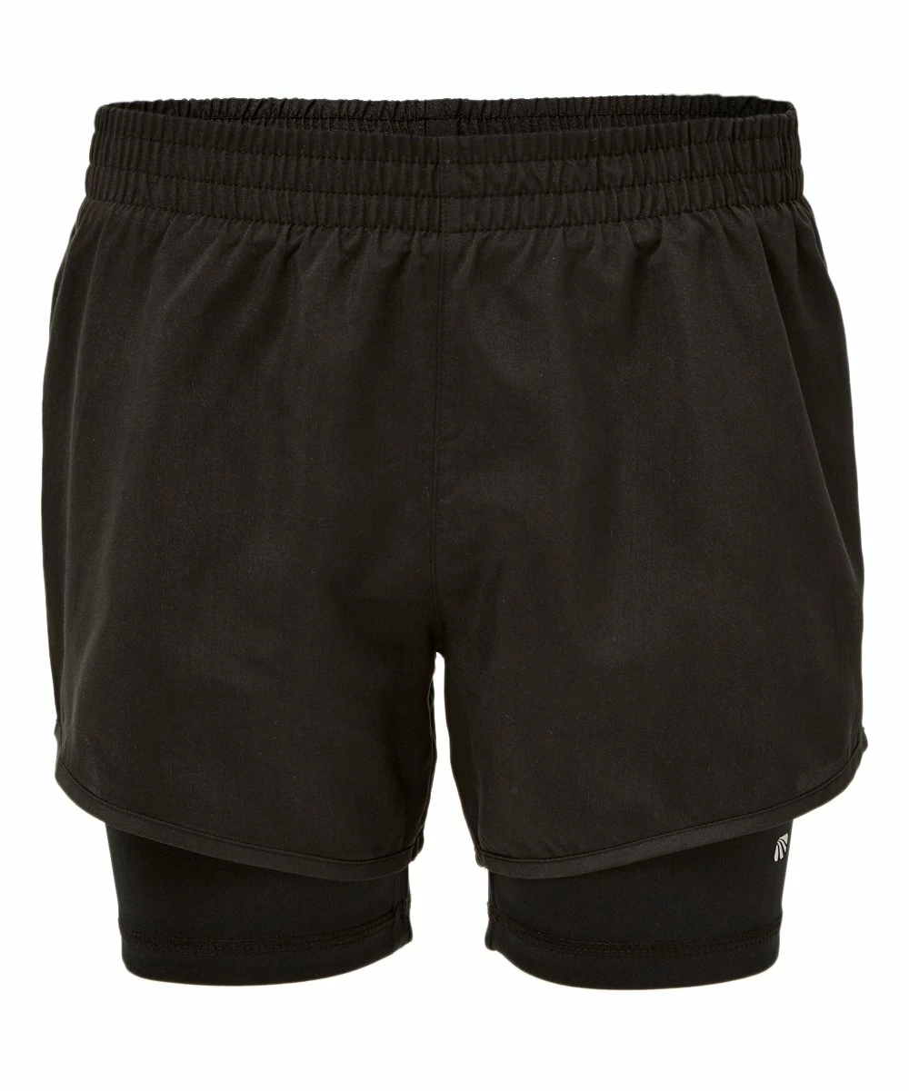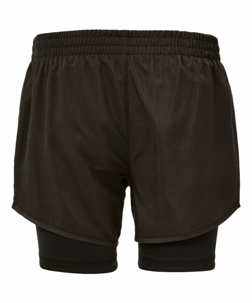 These shorts offers a woven outer with a fitted knit short underneath. Elastic waist.