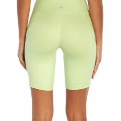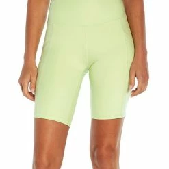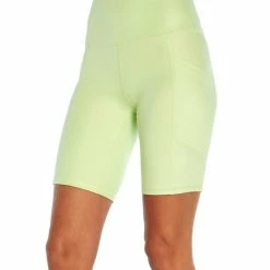 These solid-color bermuda bike shorts feature shiny stretch fabric with seam detailing and side phone pockets.