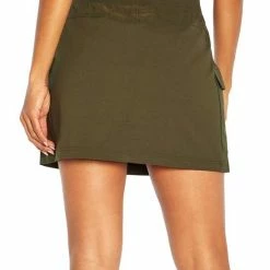 This solid-color skort is made with stretchy nylon-blend fabric with back-ribbed elastic waistband and snap side pockets.