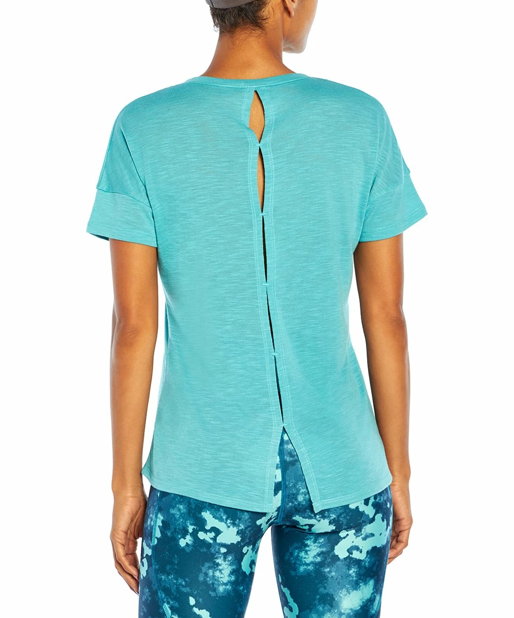 This athletic tee features jersey-knit slub fabric with a keyhole-line back and hi-low hem.