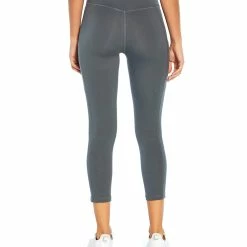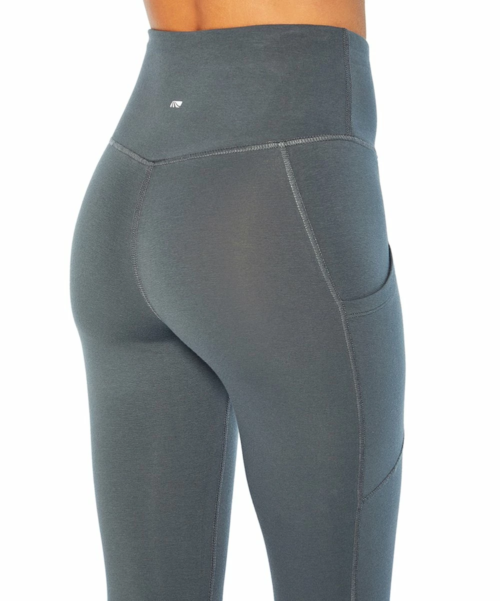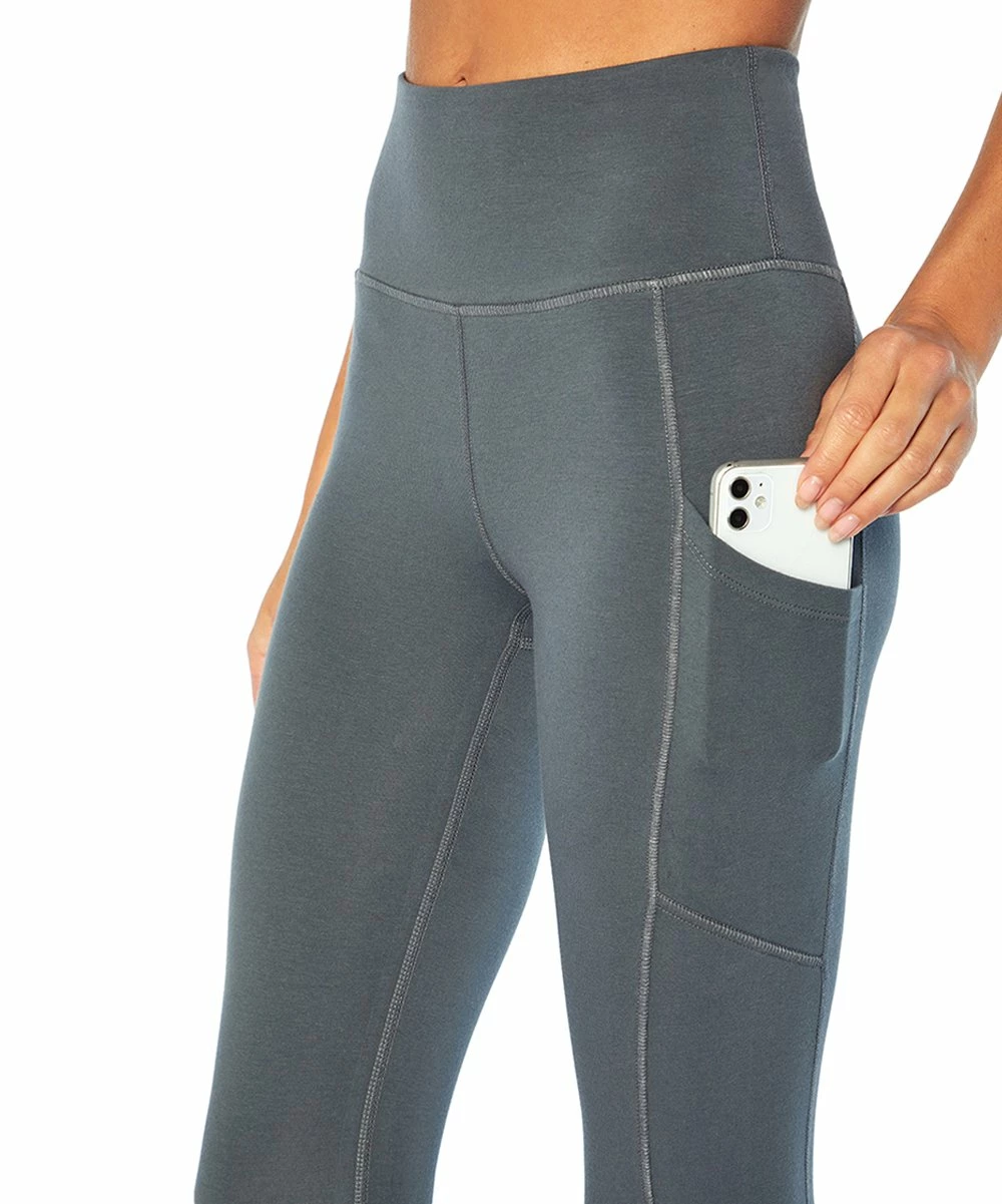 These versatile gray leggings boast exposed seam detailing, a high-waist fit, and a cellphone pocket.