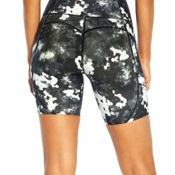 These printed bike shorts feature stretchy fabric with a wide waistband and side pockets.
